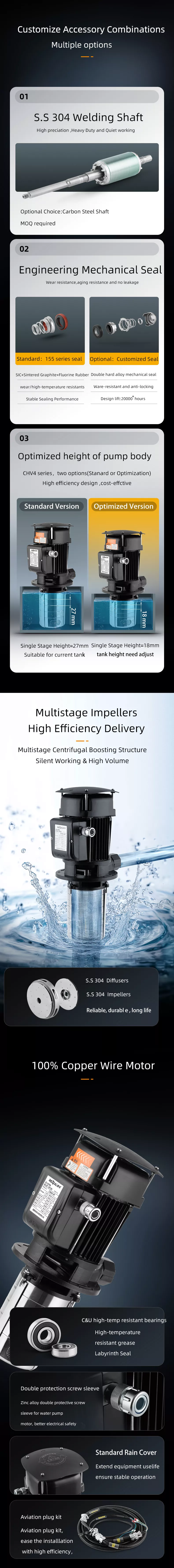 다음은 CHV 시리즈 CHV 침수형 다단 원심 펌프에 대한 소개입니다. 특히 공작 기계용 냉각 윤활제 펌핑용으로 설계되었으며 펌프 스택이 펌핑된 액체에 잠겨 있는 탱크 상단에 장착됩니다. STAIRS SBK 펌프는 필요한 유량, 압력 및 길이를 제공하기 위해 다양한 펌프 크기와 다양한 단계 수로 제공됩니다.