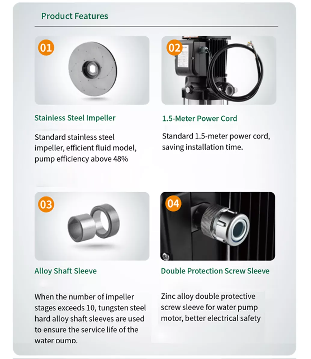 다양한 요구 사항을 충족하기 위해 임펠러 수를 변경하여 펌프 헤드를 조정할 수 있습니다. 깨끗한 물이나 유사한 특성을 가진 액체에 적합하며, 특정 모델은 부식성 매체에 맞게 맞춤화될 수 있습니다.